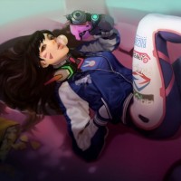 The image features an animated character lying on her back with one leg bent at the knee. She appears to be in a relaxed or casual pose, wearing a blue and white outfit that resembles the attire of D.Va from the video game "Overwatch." The artwork is detailed and vibrant, capturing a moment that contrasts with her usual character portrayal.