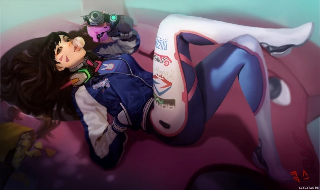 На изображении изображен анимированный персонаж, лежащий на спине с одной ногой, согнутой в колене. Она выглядит в расслабленной или непринужденной позе, в сине-белом наряде, напоминающем наряд Д.Ва из видеоигры «Overwatch». Работа детализирована и яркая, захватывая момент, который контрастирует с ее обычным изображением персонажа.