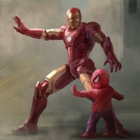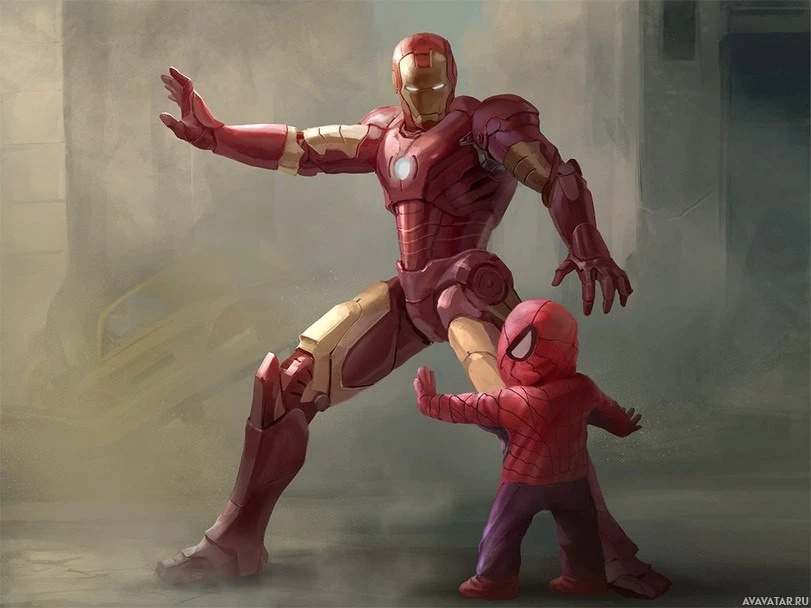 comic books and movies, known for his spider-like abilities including agility, speed, and the ability to cling to surfaces. Between them stands a small child in an Iron