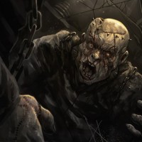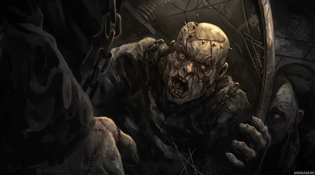 the ominous mood of the image. The lighting is dim and focused on the characters, creating shadows and highlights that emphasize their features. The presence of what appears to be a monster or undead creature suggests that this could be a scene from