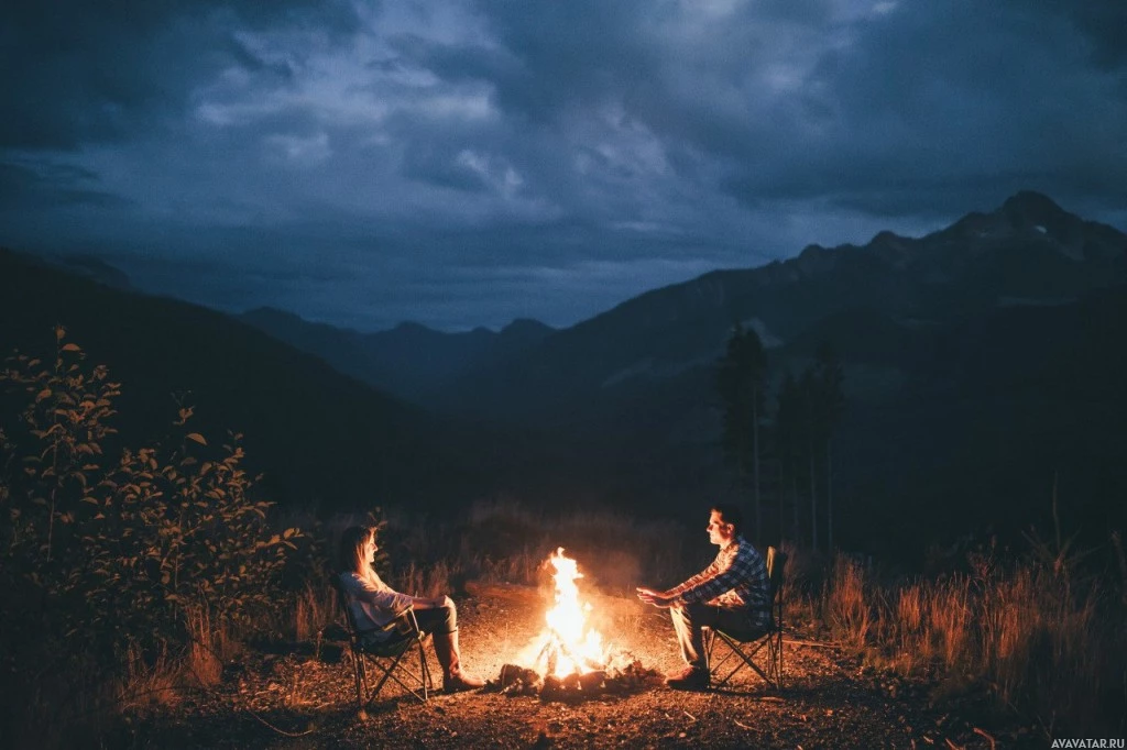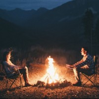 outdoor scene with two people sitting closely together on chairs in front of a campfire. They appear to be enjoying each other's company, possibly engaged in conversation or simply enjoying the warmth and ambiance of the fire. This setting is typical for
