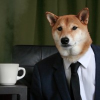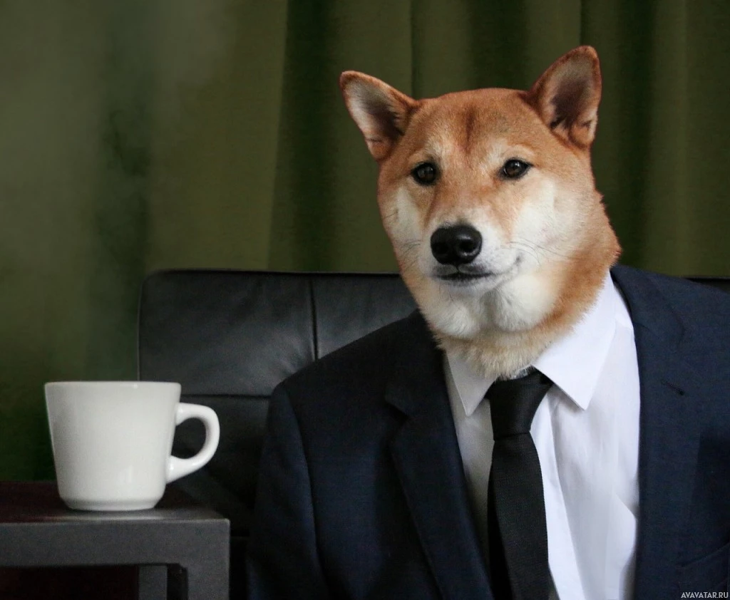 На изображении изображена собака, одетая в человеческую одежду, в частности, в костюм и галстук. Похоже, он сидит за столом с кружкой на столе перед ним. Есть небольшой эффект размытия, который придает картине художественный оттенок. Это может быть рабочая среда или постановочный сценарий, предназначенный для развлечения или юмора.