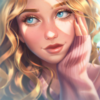 a young woman with blonde hair and blue eyes. She has a soft, round face with