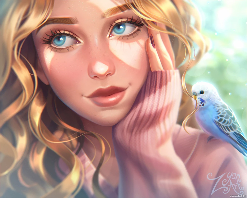 small bird with blue feathers is perched on her shoulder, adding a gentle, serene quality to the scene. The background suggests