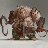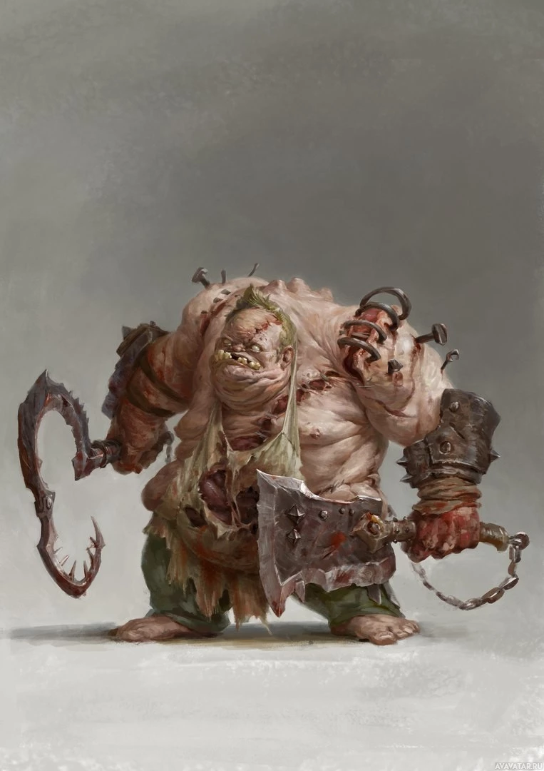 a muscular build and is equipped with various weapons such as a large sword that resembles a scythe and what appears to be a shield. Pudge's skin is pale, indicative of his
