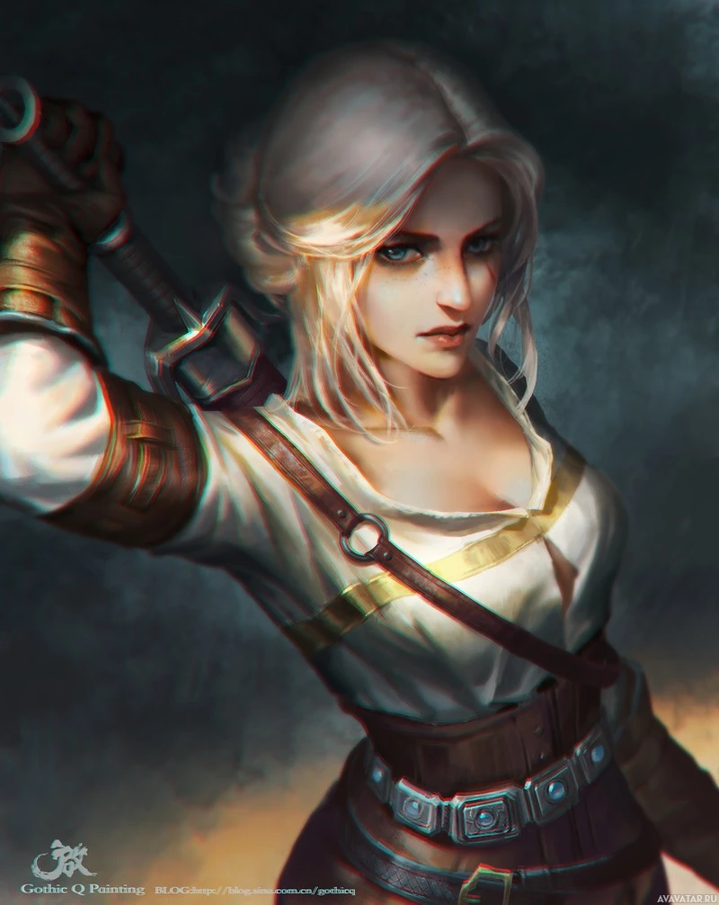 На этом изображении изображен персонаж из видеоигры «Ведьмак 3: Дикая Охота». Персонажа зовут Чири, и она изображена со светлыми волосами, в доспехах и с мечом. Ее выражение кажется серьезным или решительным.