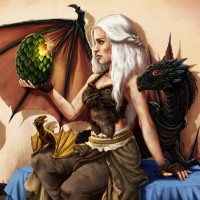 a dragon egg in one hand and two fully-grown dragons at her feet. The setting appears to be a simple