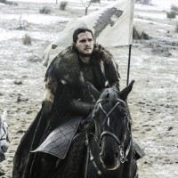 Jon Snow, portrayed by actor Kit Harington, is riding one of three horses alongside other characters. The setting appears to be in a barren landscape, possibly representing a northern region from the series'