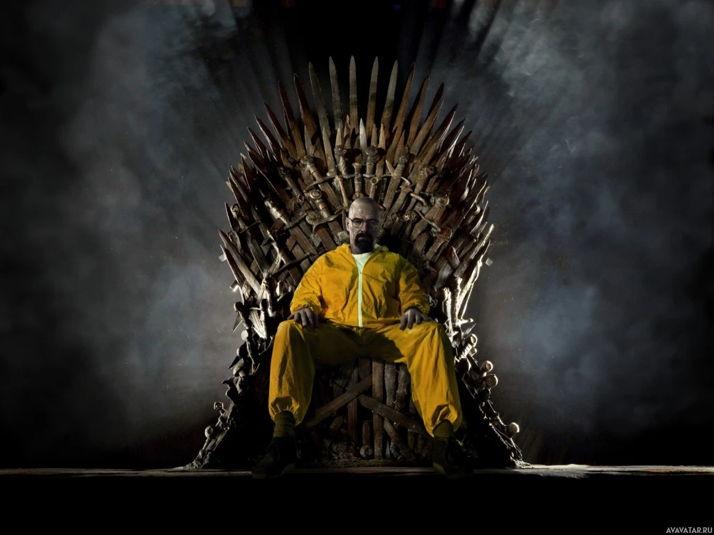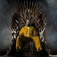 The image features a person dressed in an orange jumpsuit sitting on the Iron Throne from the television show "