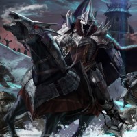 various weapons. One figure stands out as being particularly menacing, wearing a dark armor and helmet with