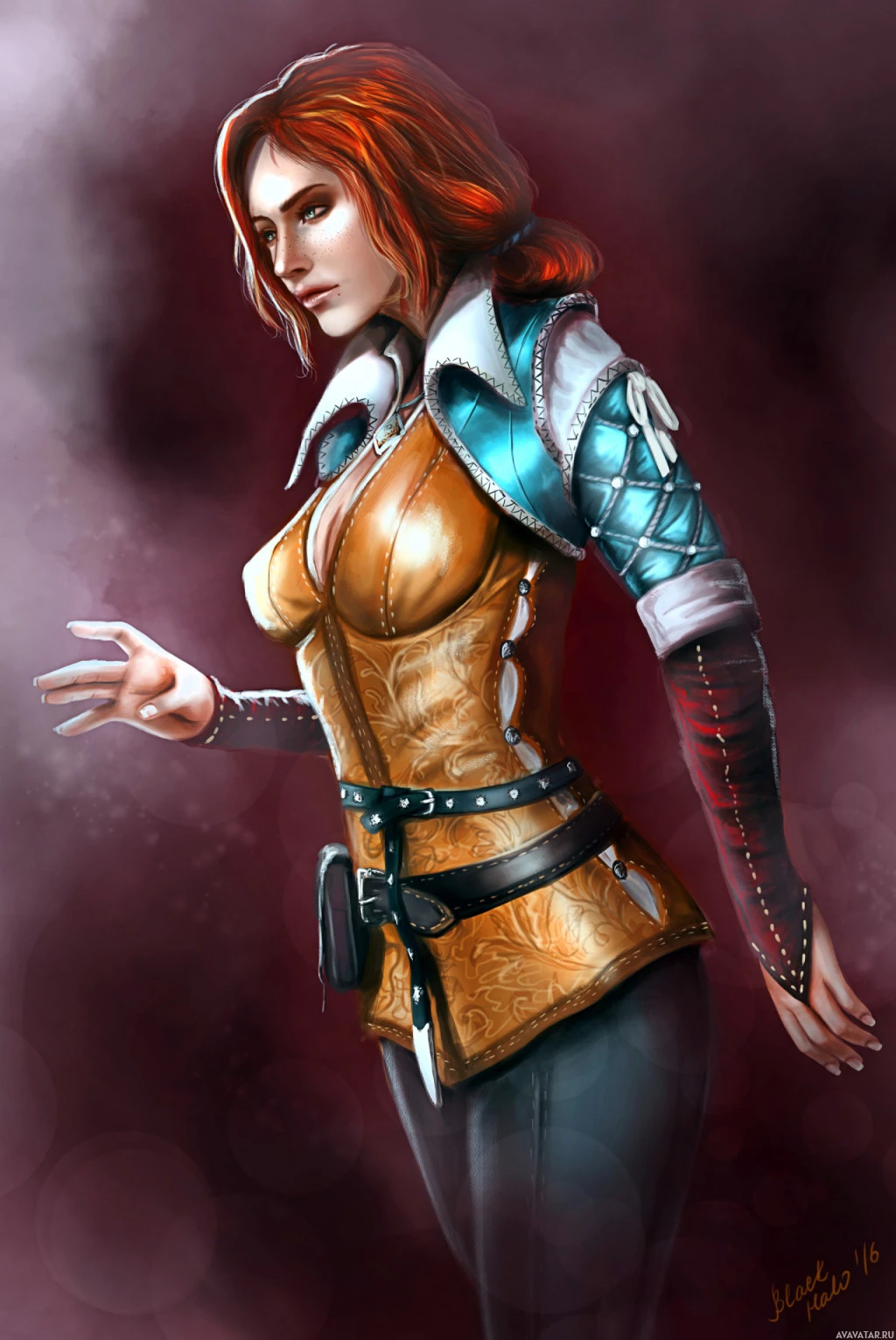 Triss Merigold from "The Witcher" game series. She is depicted in a three-quarter view, with
