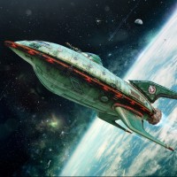 sleek lines and futuristic elements that are characteristic of the series' visual style. It is set against the backdrop of space, featuring stars, planets, and other