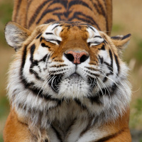 The image features a tiger with its eyes closed, appearing to be relaxed. The tiger's fur is striped in the characteristic pattern of