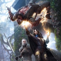 dark hair and is wearing a silver armor with a cape. In the background, there's a rugged landscape with trees, rocks, and what appears to be a ruin or ancient structure. The style of the image is typical of promotional artwork for video games, showcasing the characters in dynamic poses and action-oriented scenes.
