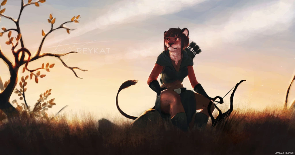 the warm lighting and the silhouette of trees behind them. The character is holding a bow and has a quiver full of arrows at their side, suggesting that they are prepared for hunting or combat. The overall atmosphere of the image is serene and somewhat mystical due to