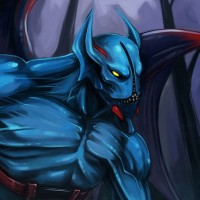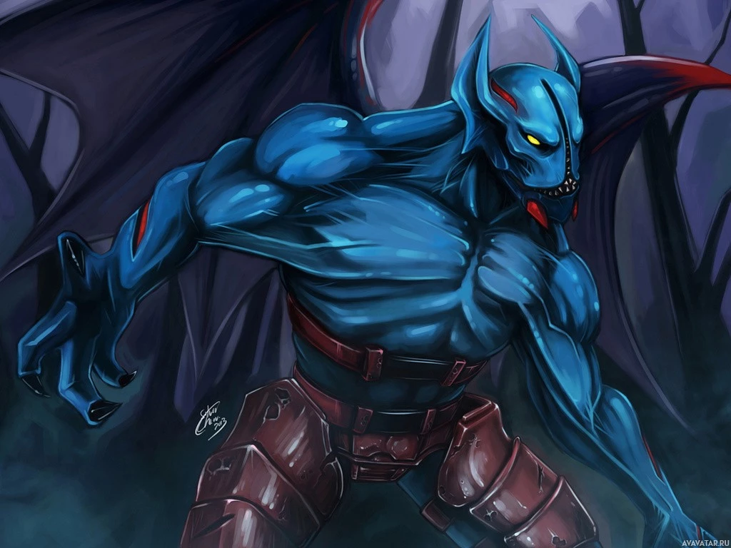 the Night Stalker from the game Dota 2. This character is known for his agility, strength, and ability to quickly close distances with enemies due to his Blink Dagger. He is portrayed in a stylized