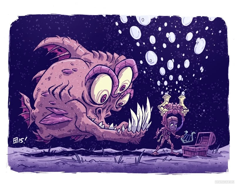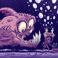an oceanic setting with bubbles floating around the characters, indicating that they may be at depth. The artwork has a playful and whimsical quality to it, despite the potentially
