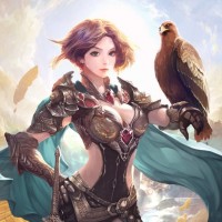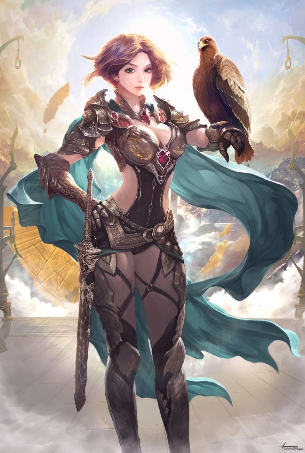 an illustrated character, a female warrior or fantasy figure, dressed in armor and holding a falcon. She is depicted with
