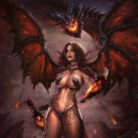 red wings, horns, and is adorned with intricate tattoos or markings on her body, suggesting a powerful or magical nature. The character is holding what looks like a staff or wand, which adds to