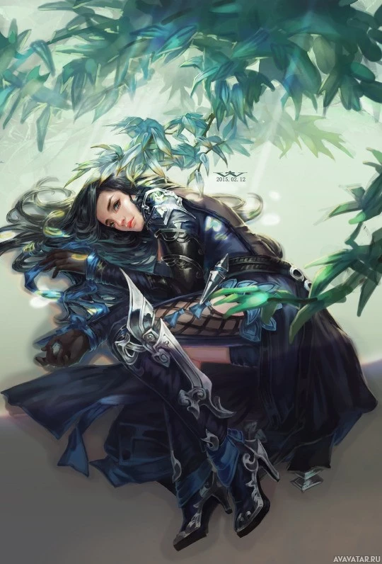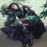 a female character, possibly from a fantasy or video game setting. She is seated with her head resting on one hand, suggesting she might be asleep or lost in thought. She is dressed in what appears to be