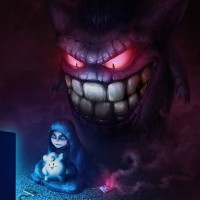different sources. The central figure seems to be a character resembling Mewtwo from the Pokémon franchise, with a menacing and ominous expression. Surrounding this character is dark smoke or fog, giving it