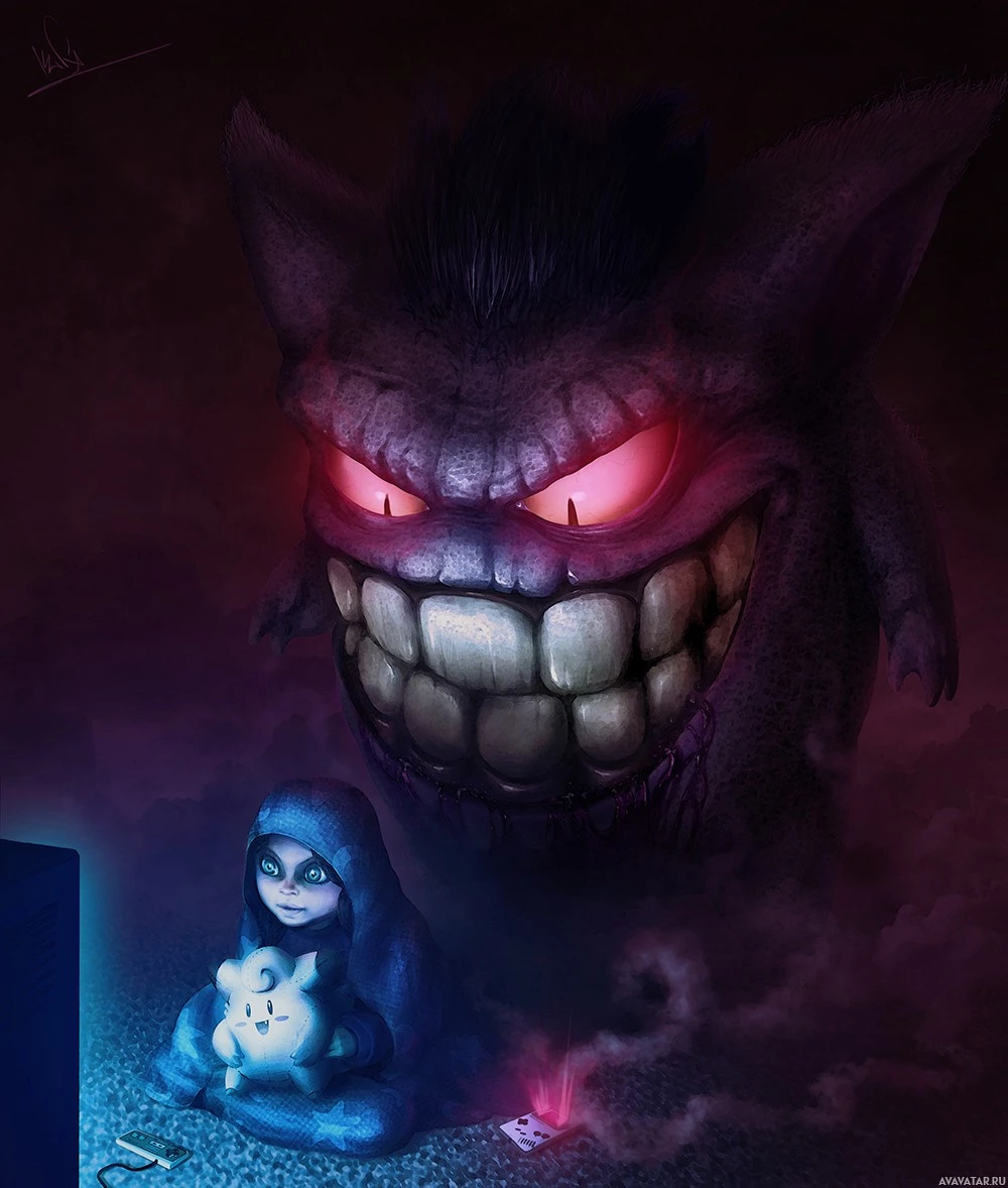 an intimidating presence. Below and to the left of the Mewtwo-like character is a child in a blue hoodie looking up towards the threatening figure, while holding what seems to be