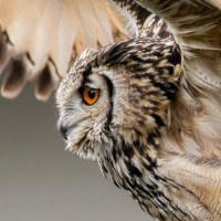 the prominent eyes, tufted ears, and feather patterns which may include spots or bars on the body.