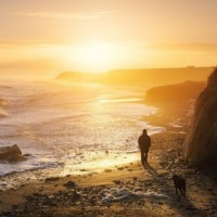 a silhouette of a person walking along the shoreline, and it appears to be a dog as well. The sea is visible with