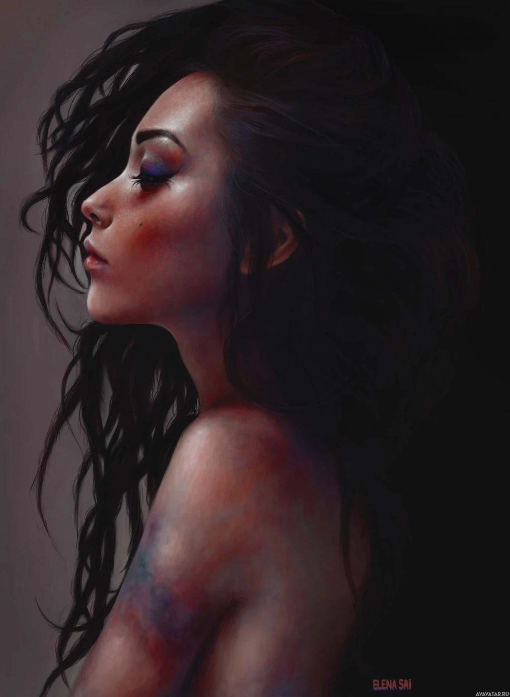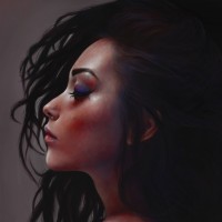 deep thought. Her skin tone is quite pale, and the paintwork includes shades of purple, blue, and black, creating a dramatic and moody atmosphere. The overall style of the painting leans towards realism with an artistic flair, emphasizing