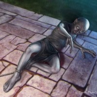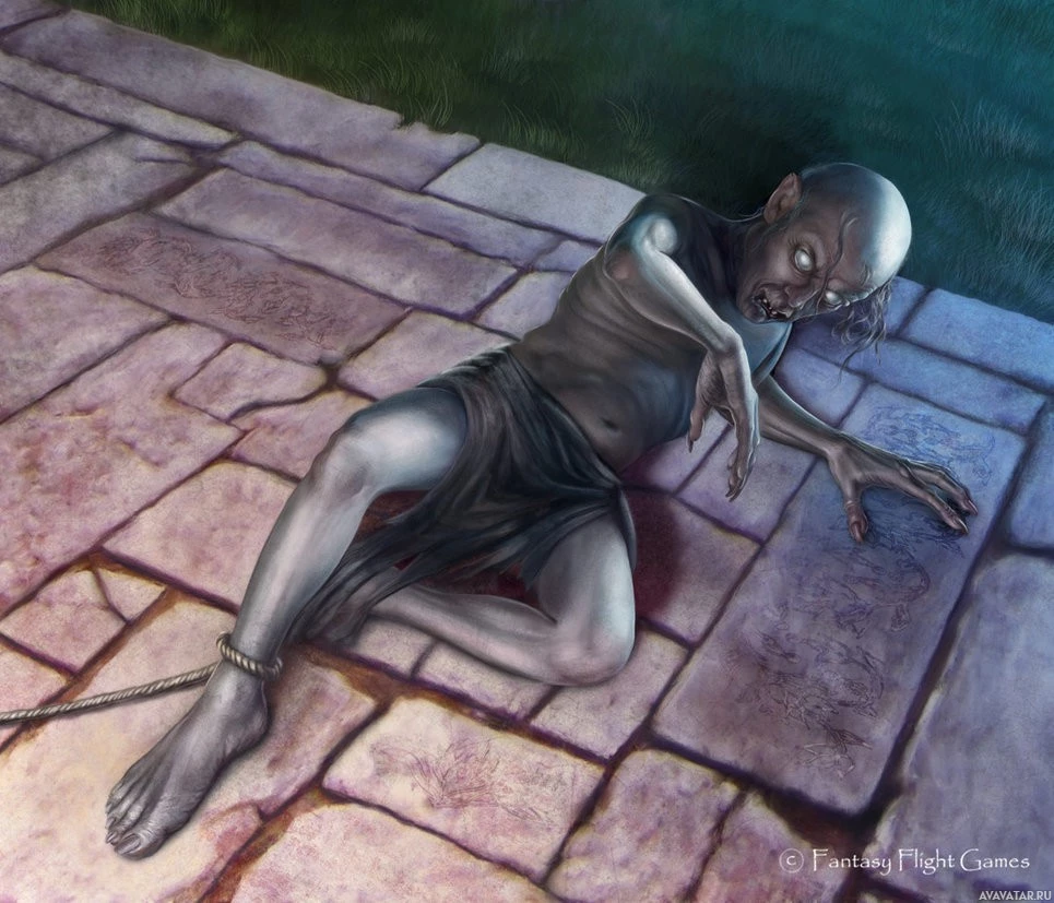 a fantasy scene with an individual who appears to be in distress or discomfort. The figure is lying on the ground, seemingly exhausted or ill. It is not explicitly stated if this character is Gollum from Middle-earth, as that identification relies on