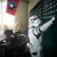 the Imperial forces from the movies. On the right side of the image, there's a scene from an actual classroom setting where a student is sitting in front of a desk, presumably being taught by someone off-frame, possibly another stormtrooper or a teacher. The juxtaposition of these two scenes creates a comedic contrast between the formality and discipline typically associated with stormtroopers and their roles in the Star