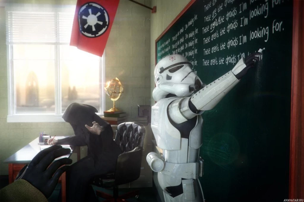 the Star Wars franchise in an educational setting. On the left, there is a stormtrooper standing at attention and writing on the blackboard with chalk. This character is iconic to