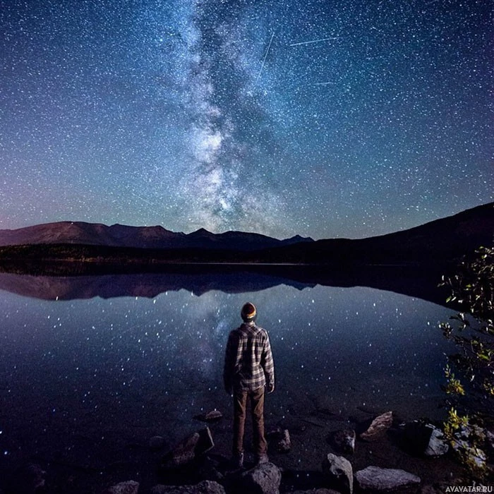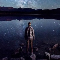 a night sky filled with stars. The individual appears to be contemplating or admiring the view. Behind them is a serene landscape featuring a still lake reflecting the stars above and mountains in the distance under