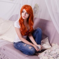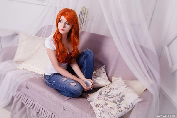 red hair, reminiscent of Mary Jane Watson from the Spider-Man comics and movies, and is wearing casual clothing that includes jeans and a t-shirt. Her pose seems relaxed, with her hands resting in her lap, and she appears to be looking directly at the camera. The setting looks like a cozy