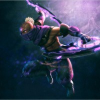a dynamic pose, holding a staff with magical energy crackling around it. The background has a dark and moody atmosphere with