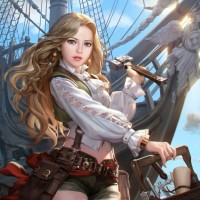 a female character with blonde hair styled in loose waves, wearing a pirate-themed outfit. She has light