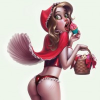 a red outfit with a hood, which matches her iconic costume. In her hand, she holds a basket filled with