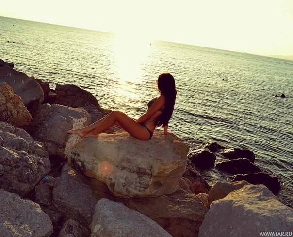 The image shows a woman sitting on rocks by the sea during what appears to be sunset. She is facing away from the camera, looking towards the horizon. The sky transitions through