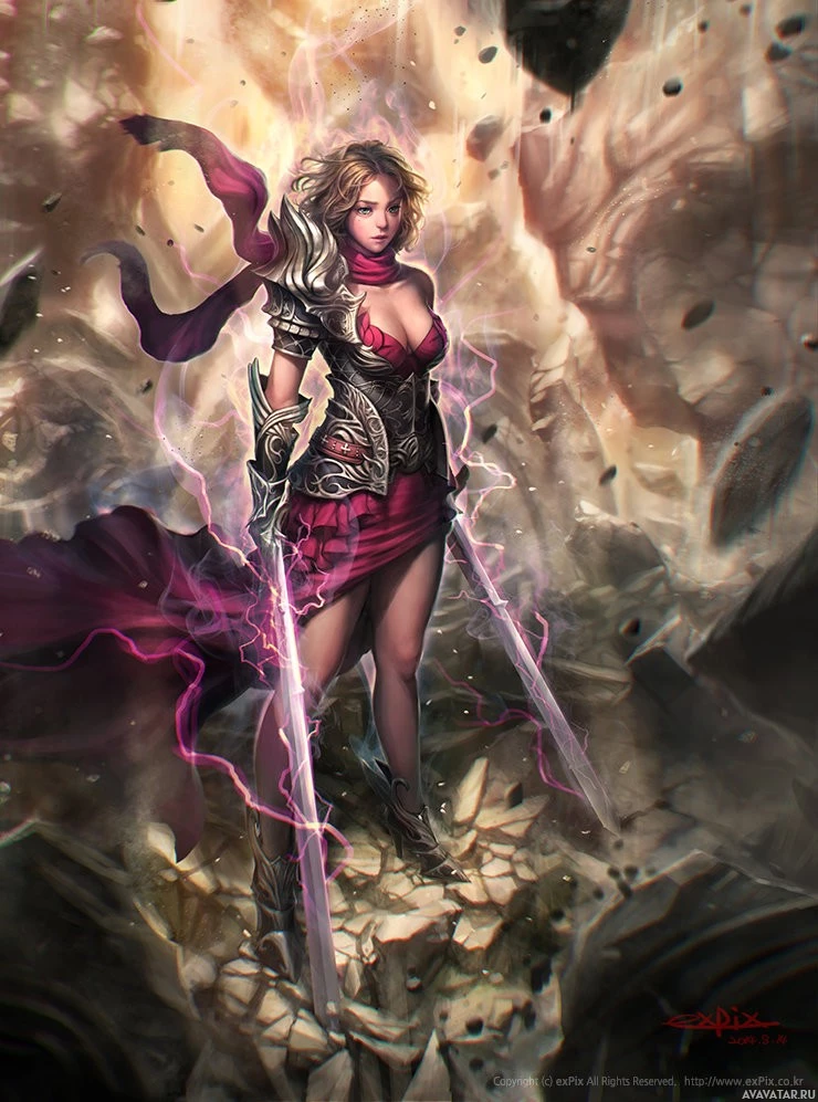 fantasy character. She is holding two swords crossed in front of her body and has a cape billowing behind her, suggesting motion or