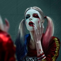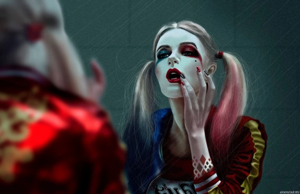 Harley Quinn, a popular comic book villain. She is shown wearing her signature black and red outfit, which includes a corset with the word "Puddin'" written on it, a symbol of her relationship with the Joker in various