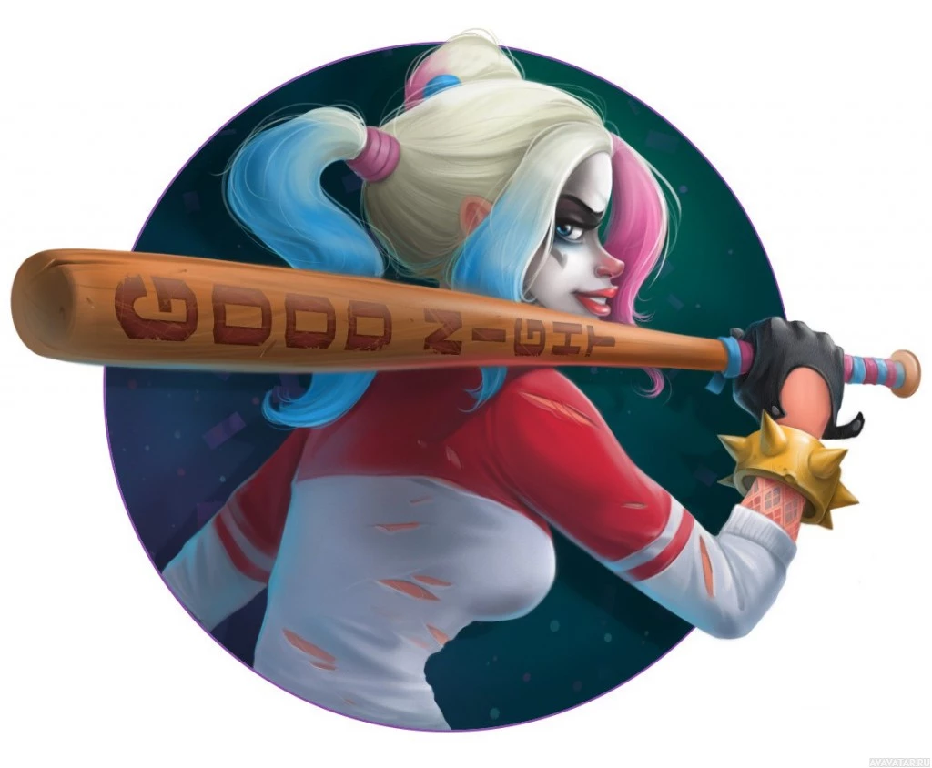a baseball bat over one shoulder and a baseball glove on the other hand, suggesting she might be ready for a game or engaging in some form of action. The character is known for her clown-like appearance with vibrant