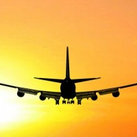 the setting sun. The plane appears to be either taking off or landing, given its position relative to
