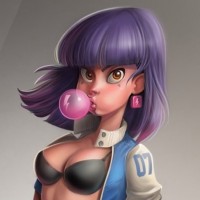 The image features an animated character with purple hair, wearing a black and white outfit. She is holding a gun in her right hand and has a bubble gum balloon in her mouth. The character has an expressive face and is standing against a dark background that seems to be part of a digital artwork or illustration.