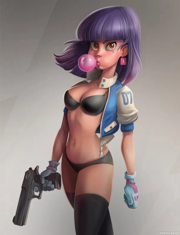 На картинке изображен анимированный персонаж с фиолетовыми волосами, одетый в черно-белый наряд. Она держит пистолет в правой руке и имеет шарик из жвачки во рту. Персонаж имеет выразительное лицо и стоит на темном фоне, который, кажется, является частью цифрового произведения искусства или иллюстрации.