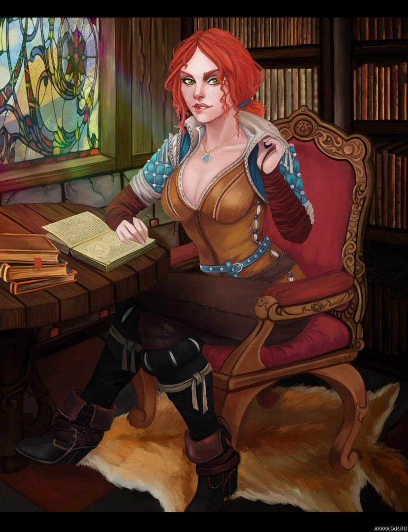 Triss Merigold from the game "The Witcher 3: Wild Hunt." She is depicted sitting at a desk with a book open in front of her, suggesting she might be reading or studying. The setting looks like a cozy