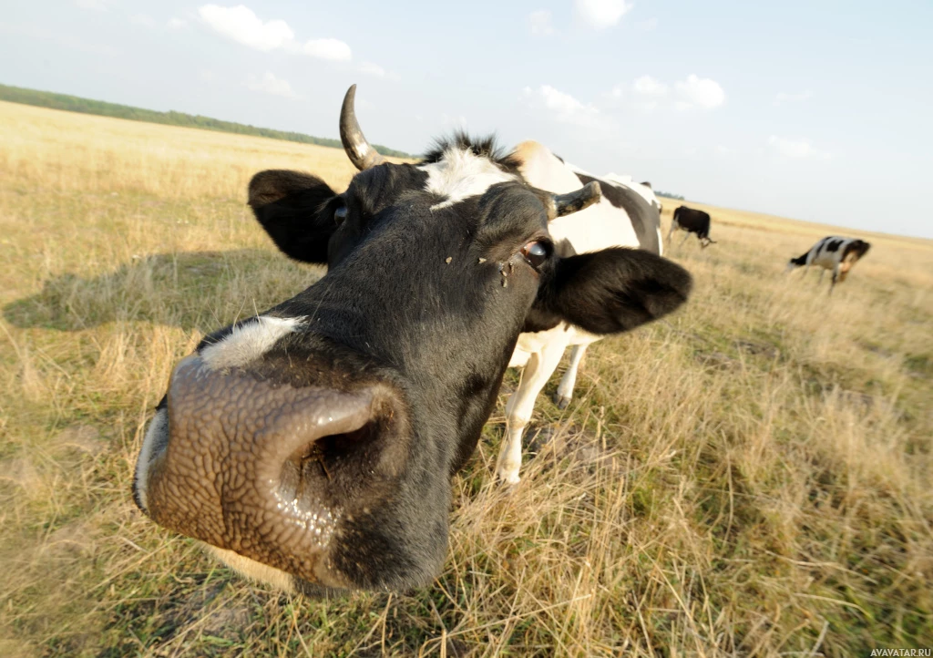 a grassy field or pasture. There are other cows in the background, suggesting that this is a farm setting where multiple animals are present. The cow has a distinctive face with a large nose and
