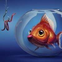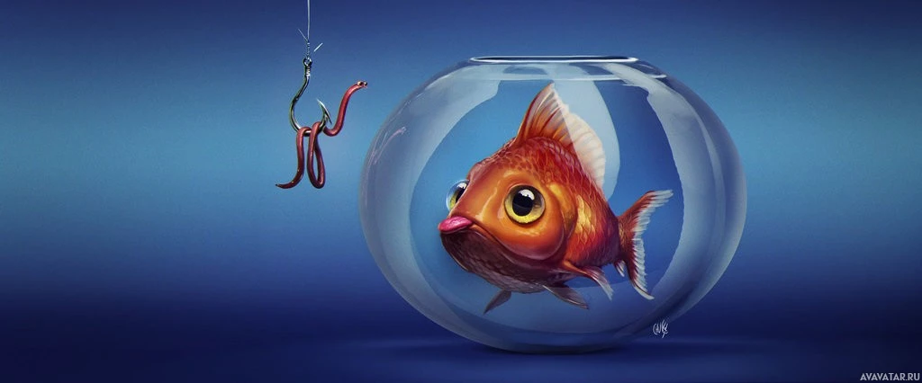 a small fish with an orange body and yellow fins, looking out from inside an aquarium. Floating just outside the glass of the tank is what appears to be a worm attached to a hook, suggesting that this image could be related to fishing or the idea of being caught as prey by other animals. The water in the tank is clear, and the background is dark blue, which contrasts with