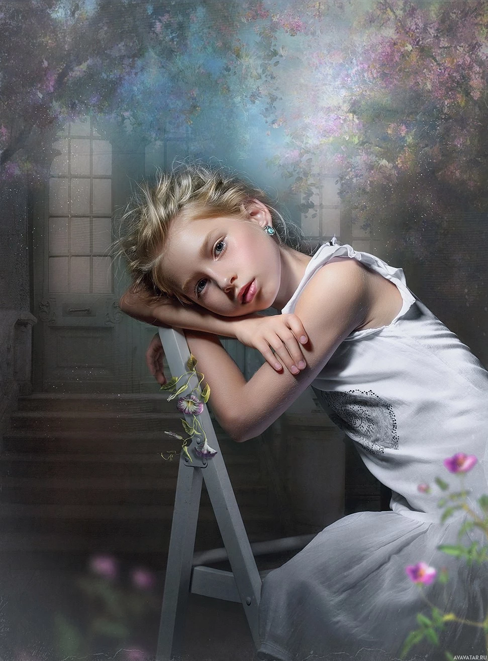a white top and has her hand resting on her cheek. There are flowers near her, adding to