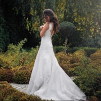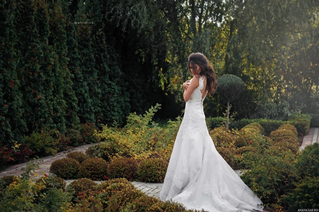 brown hair and is turned slightly to the side, looking over her shoulder towards something or someone not in frame. Behind her, there are neatly trimmed bushes and shrubs that suggest a well-maintained