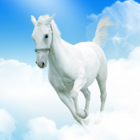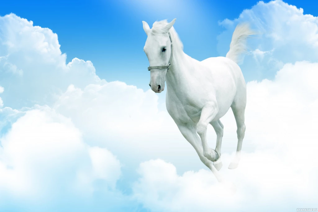 a white horse galloping in the air with its hooves off the ground. The background is clear and blue, suggesting a sky-like environment. The horse appears to be in motion with